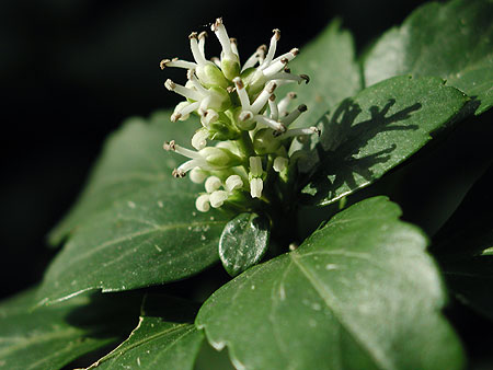 広大なカルスト台地の一角にひっそりと咲くフッキソウ(富貴草) 撮影 4月2日 旬の画像一覧へ 秋吉台の自然へ戻る