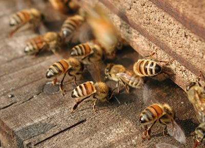 連日の暑さでセイヨウミツバチの巣の中は蒸し風呂状態、 働き蜂の雌は、花粉や蜜を持ち帰った後も、 巣の前で一生懸命、羽根で巣箱の中に風を送り込み? 雄蜂は巣箱の中から出たり入ったり、 子孫を残すだけの役割、中で何をしているのでしょうね。 ニホンミツバチの場合は向きが逆で、巣箱を背に扇ぐそうです。 撮影 6月2日