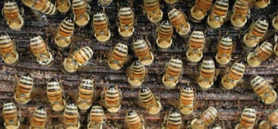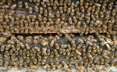 蒸し暑い日が続き セイヨウミツバチの巣箱にもカビでも生えたのでしょうか 巣箱の中や外では大掃除が始まっていました みんな一斉に並んで小刻みに口を動かし 上から下へと箱の表面を削り取る 撮影 7月9日