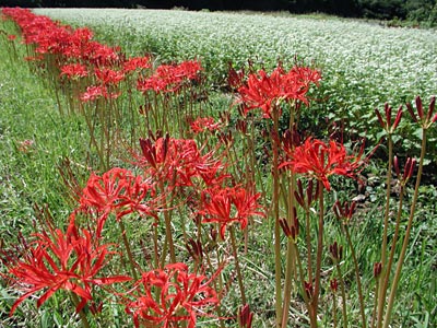 今日は彼岸の入り 秋吉台周辺部では彼岸花が見頃を迎え 蕎麦の花に映える彼岸花の赤もきれいです 撮影 9月19日